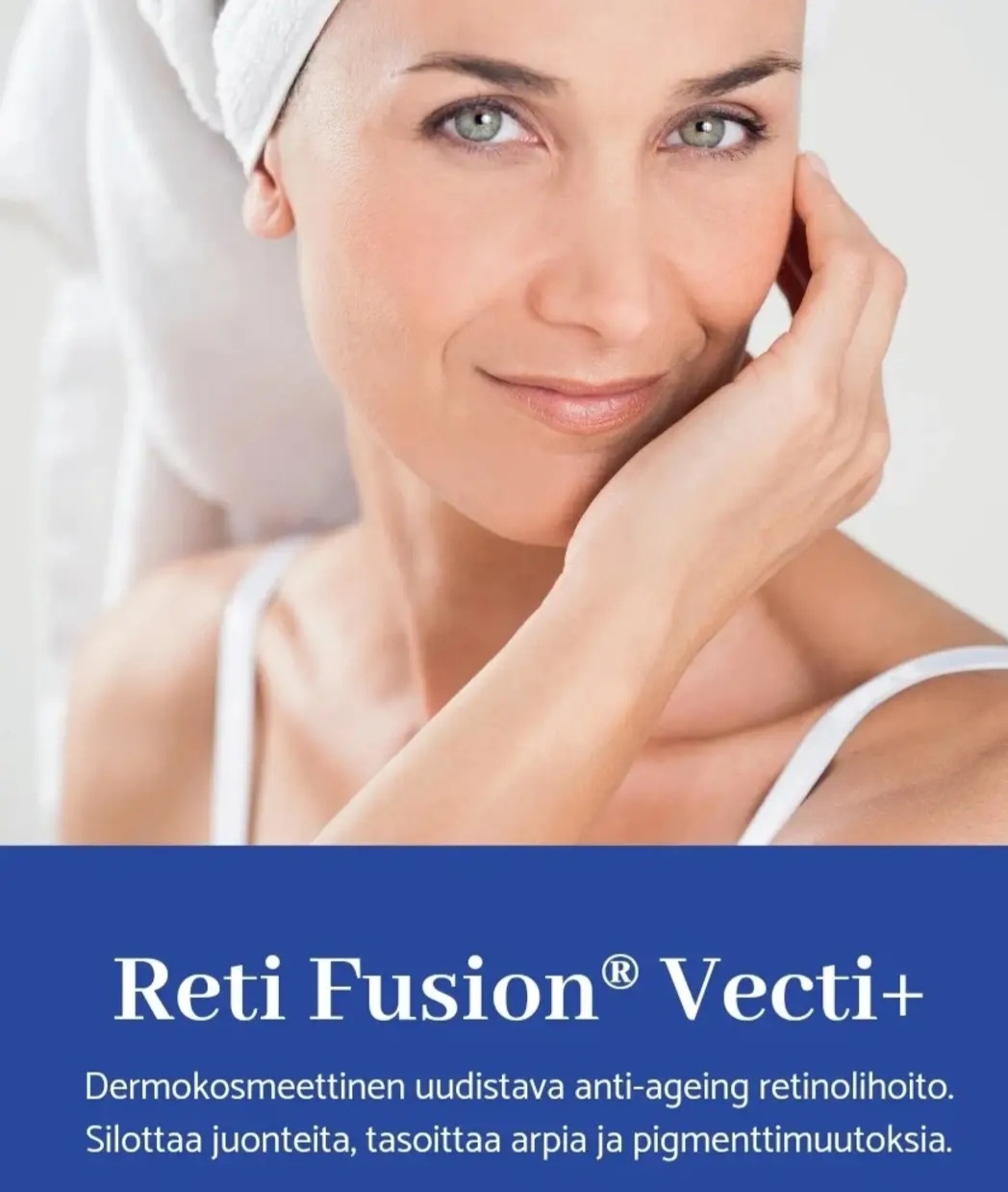 - Suosittelemme aurinkosuojaa ja hyvin kosteuttavaa kotihoitoa hoidon jälkeen Reti Fusion Vecti -kasvohoito on tehokas retinoli-pohjainen anti-age-hoito, joka on suunniteltu uudistamaan ihoa syvemmältä, tasoittamaan juonteita ja pigmentaatiota sekä parantamaan ihon rakennetta ja sävyä.