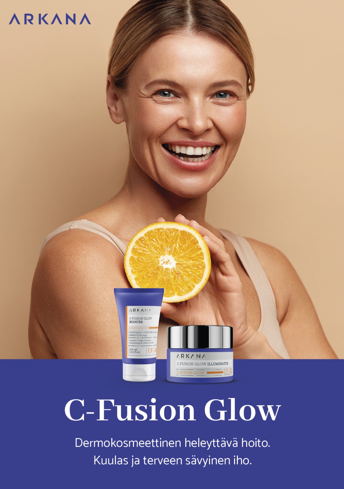 C-Fusion Glow -hoito perustuu korkeaan pitoisuuteen C-vitamiinia sen kolmessa tehokkaimmassa muodossa. C-vitamiini on lisäksi yhdistetty kurkumaan, joka antaa sille todellisia supervoimia. Tämä kolmen C- vitamiiniin yhdistelmä imeytyy syvemmälle ihoon, jossa se vapautuu asteittain vaikuttaen useiden tuntien ajan. Se takaa huomattavasti paremman stabiliteetin kuin muut, ei-kapseloidut muodot. C-vitamiinin tehokkuutta mitataan myös sen kyvykkyydellä imeytyä ihon suojaavan happovaipan läpi, jossa kapselointi on avainroolissa. Ihosta tulee välittömästi kirkkaampi ja heleämpi∙ takaa pitkäkestoisen vaikutuksen solutasolla∙ antaa iholle elinvoimaa ja parantaa sen vastustuskykyä huomattomasti.