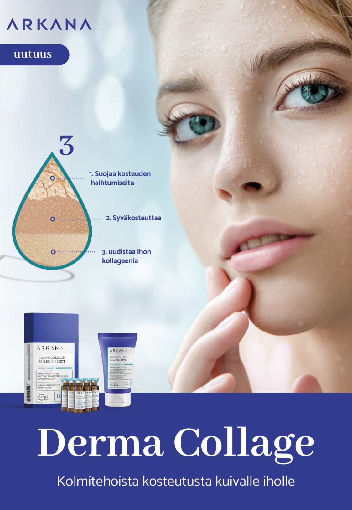 Jokaisen iho tarvitsee kosteutta. Kosteusköyhä iho menettää kimmoisuuttaan ja joustavuuttaan, ja se muuttuu karheaksi ja alttiimmaksi allergioille ja ärsytyksille sekä juonteiden esiintyminen lisääntyy. Myös kollageenin ja elastiinin tuotanto heikentyy , mikä taas kiihdyttää ikääntymisen muutoksia. Derma Collage- kolmitehoista kosteutusta kuivalle iholle Kolmivaikutteinen hoito kuivalle ja kosteusköyhälle iholle, jossa esiintyy pinnallisia juonteita. Hoito antaa iholle välitöntä että pitkäkestoista kosteutusta sitomalla kosteutta ihon syvimmissä kerroksissa oleviin luontaiseen hyaluronihapon ja proteiineihin. Hoito vahvistaa myös ihon kollageenituotantoa. Tuloksena optimaalisesti kosteutettu ja kauniin täyteläinen iho.