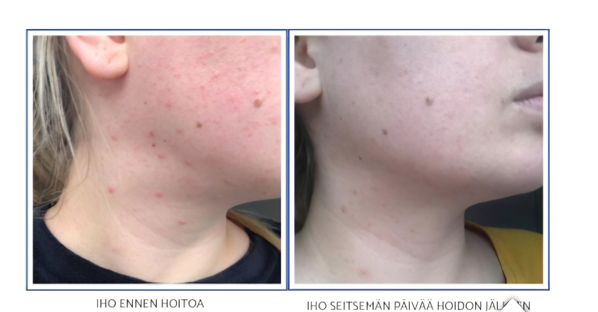 Tulokset : Lisääntynyt täyteläisyys poskipäissä ja kasvojen keskialueella. Napakampi iho ja selkeämmät kasvonpiirteet.