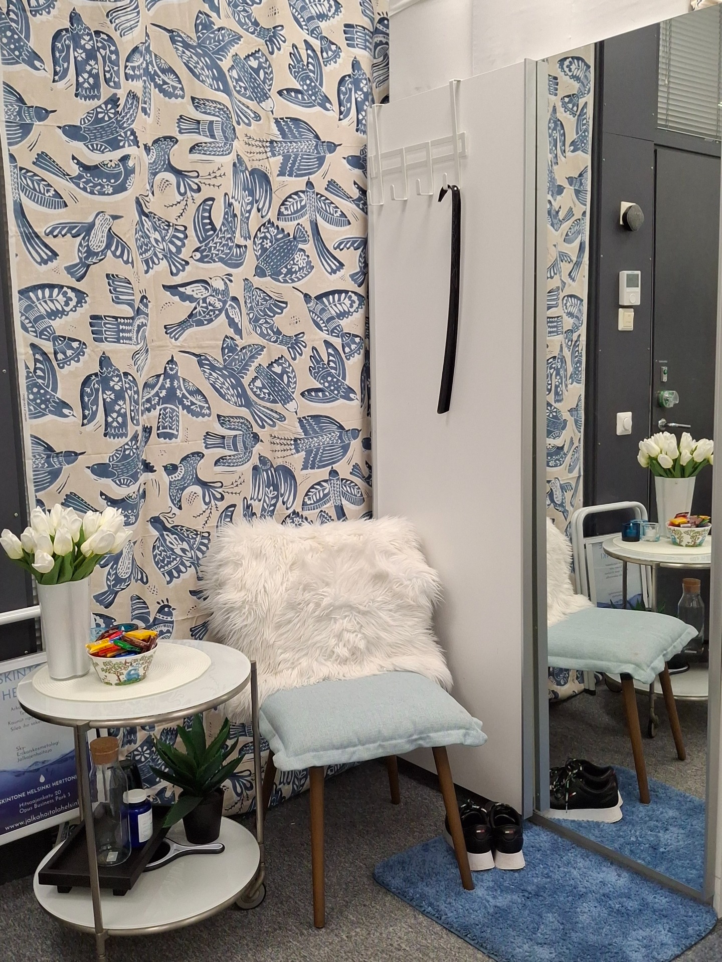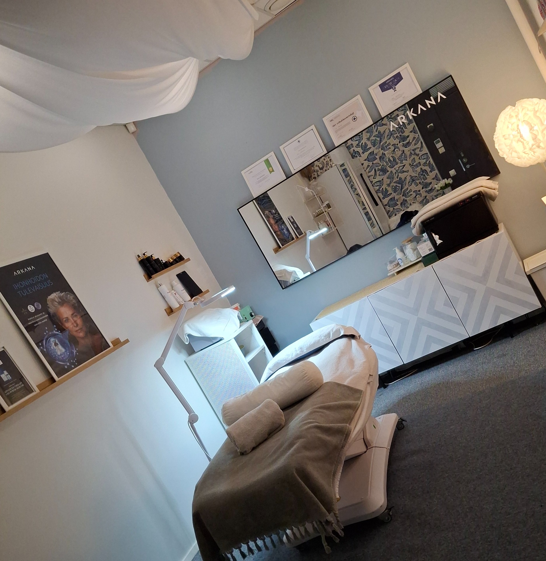 "Hoitohuoneen tunnelman olen pyrkinyt pitämään, pehmeät sävyt ja rauhallisen tunnelman, huolellisesti valitut hoitotuotteet tukevat kokonaisvaltaista hyvinvointiasi – hoitohuone on paikka, jossa voit hengähtää arjen keskellä."