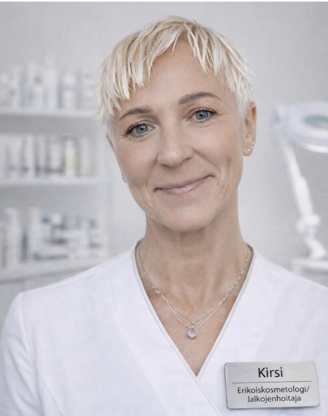 Olen erikoiskosmetologi ja jalkojenhoitaja, jonka työssä yhdistyvät rauhallinen ote, tarkkuus ja aito kiinnostus ihon sekä jalkojen hyvinvointiin. Lähestyn hoitoja: selkeästi, yksilöllisesti ja asiakkaan tarpeita kuunnellen.